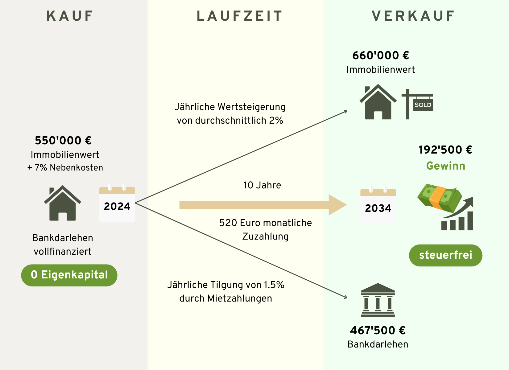 - Sie kaufen die Immobilie für 550’000 Euro ohne Anzahlung